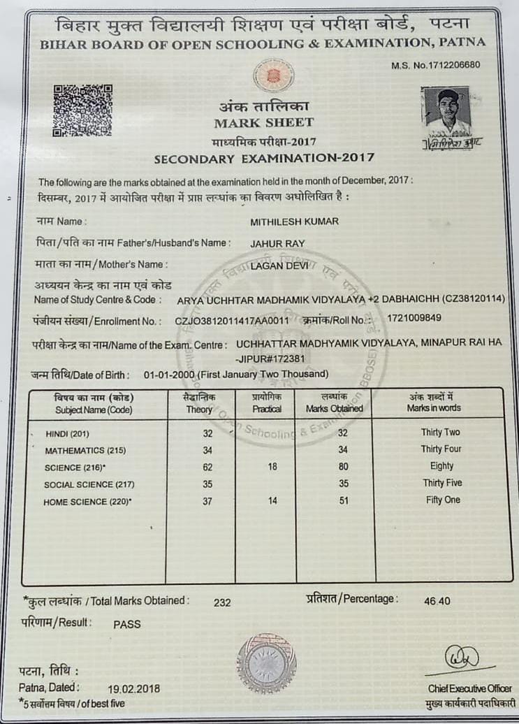 | Exam | Full Marks | Pass Marks | Marks Obtained |