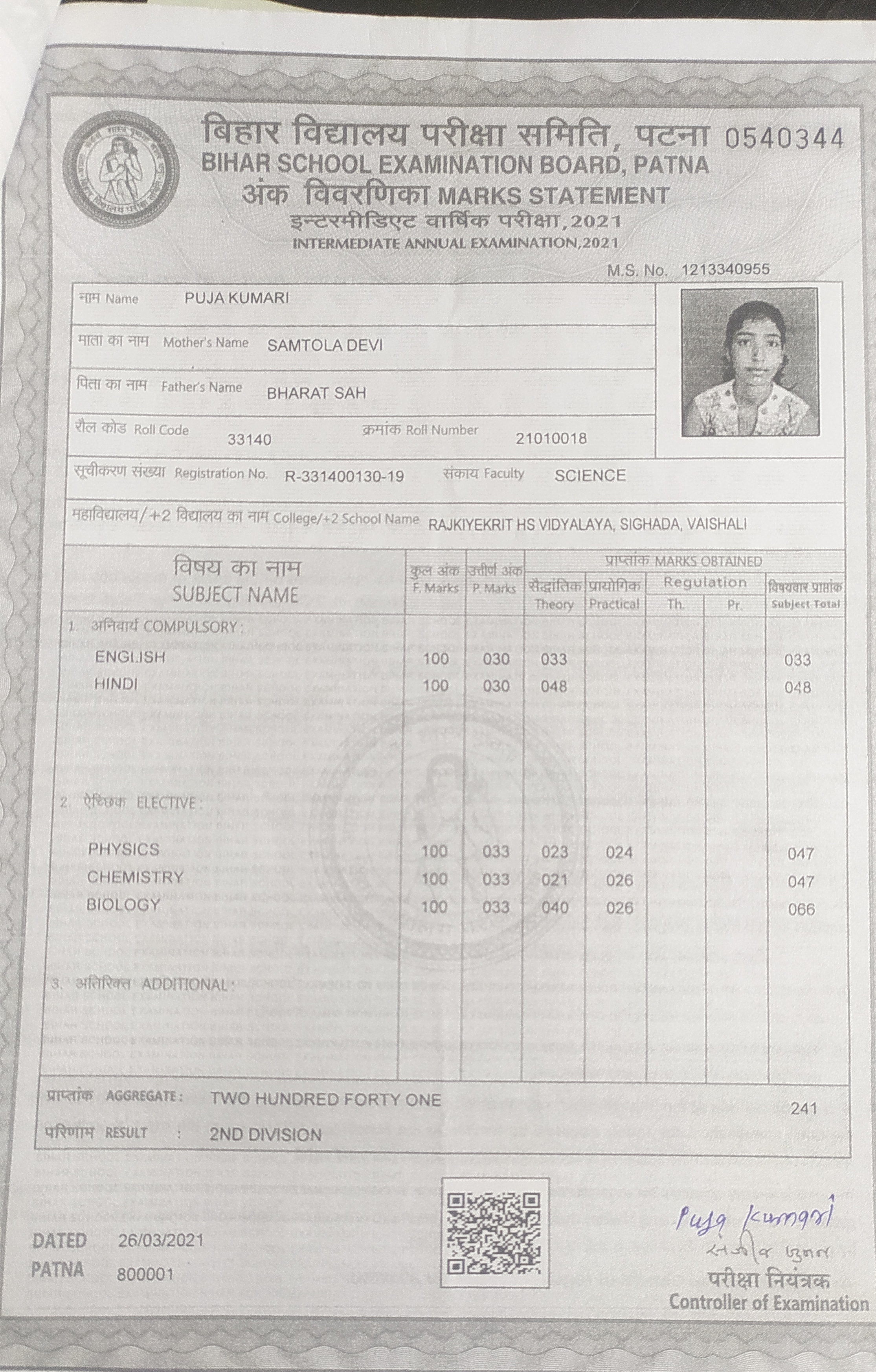 | Exam | Full Marks | Pass Marks | Marks Obtained |