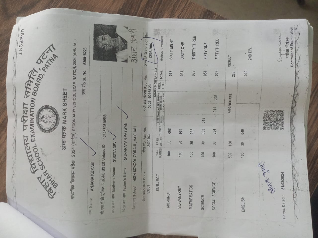 | Exam | Full Marks | Pass Marks | Marks Obtained |