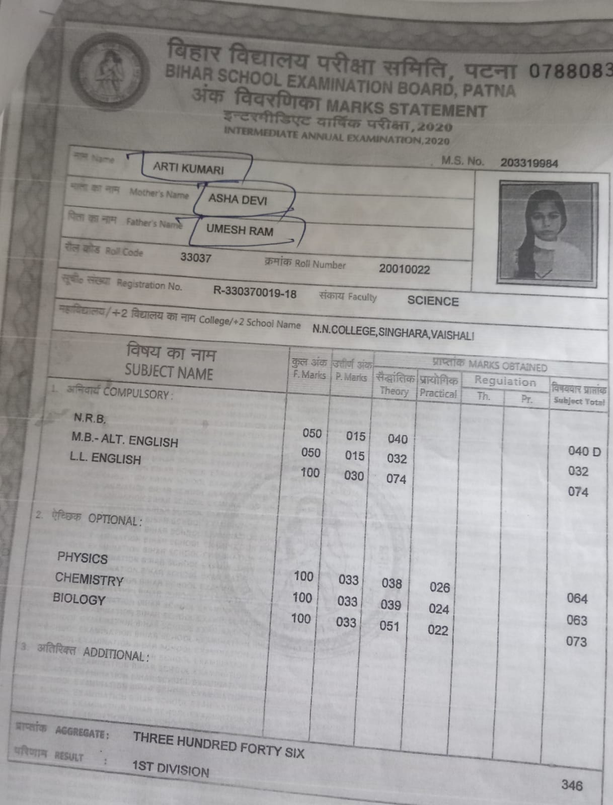 | Exam | Full Marks | Pass Marks | Marks Obtained |