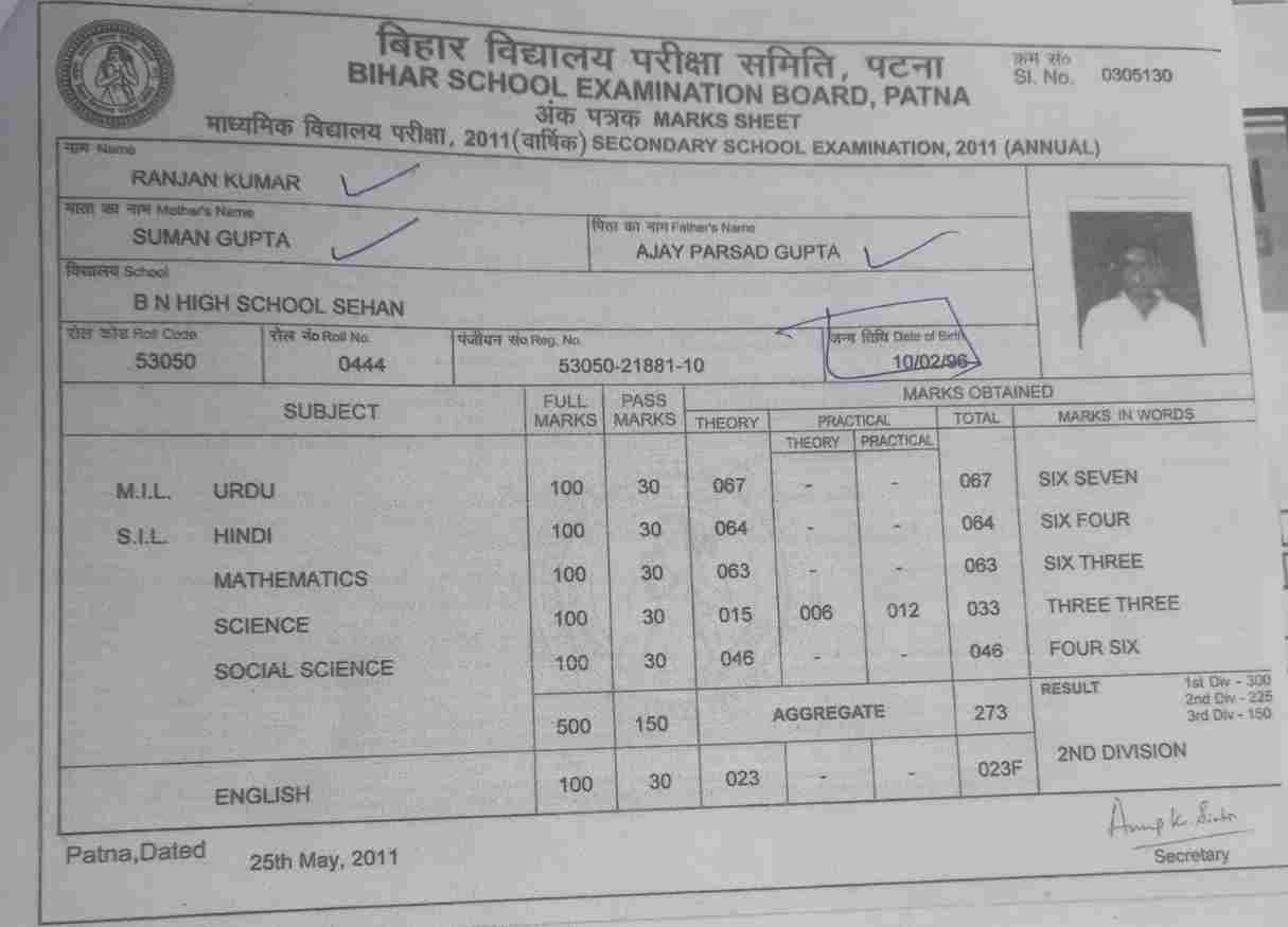 | Exam | Full Marks | Pass Marks | Marks Obtained |