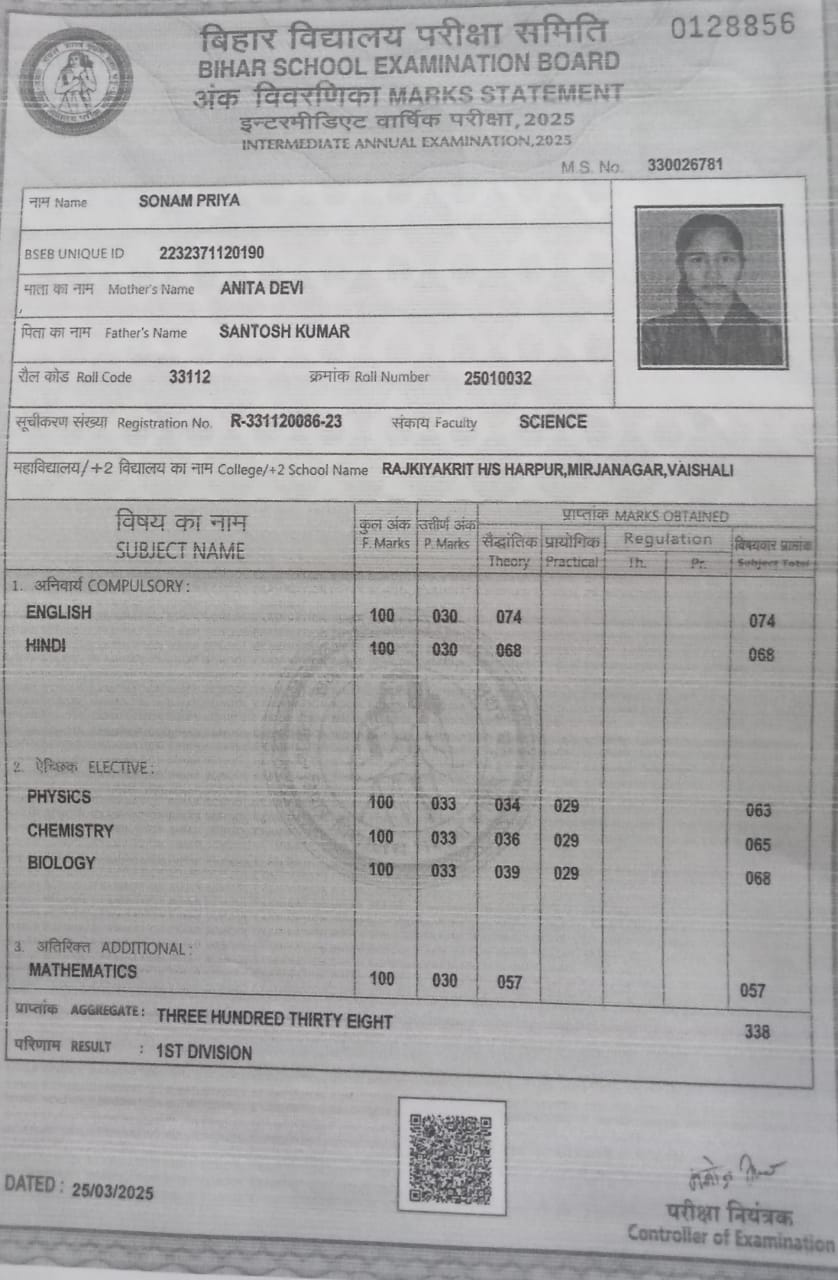 | Exam | Full Marks | Pass Marks | Marks Obtained |