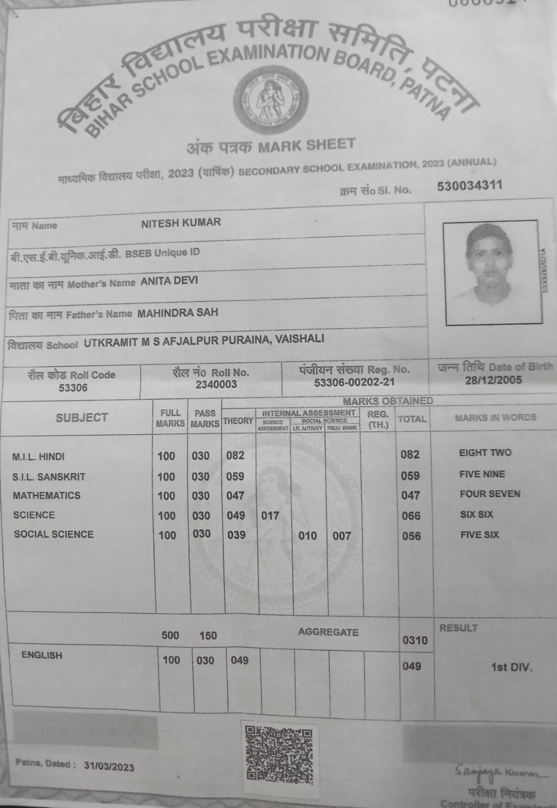 | Exam | Full Marks | Pass Marks | Marks Obtained |