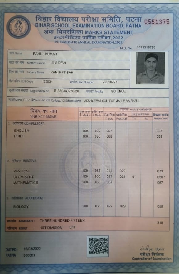 | Exam | Full Marks | Pass Marks | Marks Obtained |
