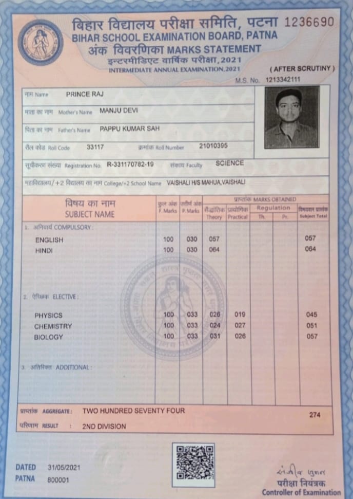 | Exam | Full Marks | Pass Marks | Marks Obtained |