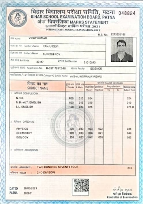 | Exam | Full Marks | Pass Marks | Marks Obtained |