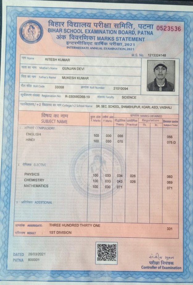 | Exam | Full Marks | Pass Marks | Marks Obtained |