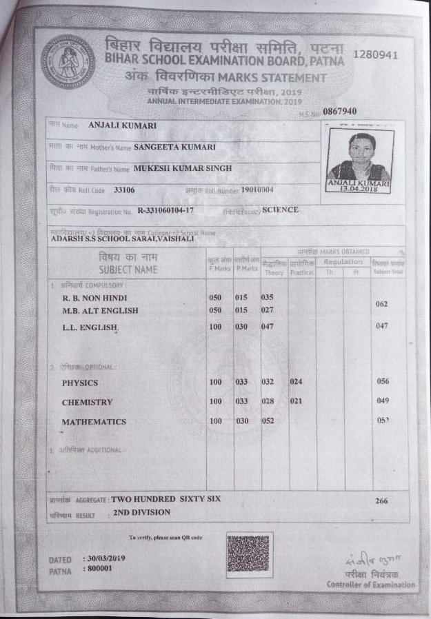 | Exam | Full Marks | Pass Marks | Marks Obtained |