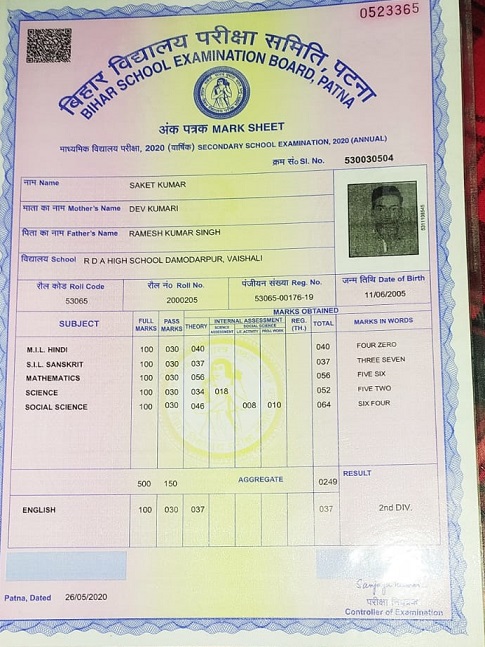 | Exam | Full Marks | Pass Marks | Marks Obtained |