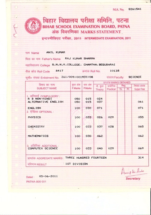 | Exam | Full Marks | Pass Marks | Marks Obtained |