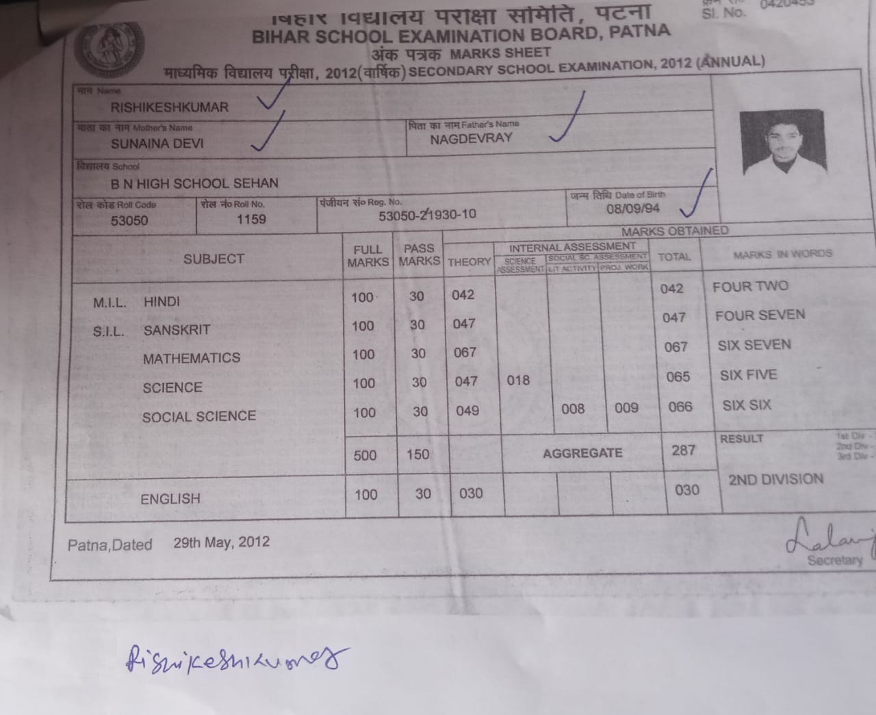 | Exam | Full Marks | Pass Marks | Marks Obtained |